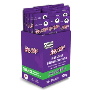 Ingredients: Beef, Salt, Sugars (sugar, dextrose, maltodextrin), Monosodium glutamate, Dehydrated jalapeno, Spices, Hydrolyzed soy protein, Jalapeno extract, Sodium erythorbate, Yeast extract, Sodium nitrite, Natural smoke flavour. Contains: Soy Ingrédients : Bœuf, Sel, Sucres (sucre, dextrose, maltodextrine), Glutamate monosodique, Jalapeno déshydraté, Épices, Protéine de soja hydrolysée, Extrait de jalapeno, Erythorbate de sodium, Extrait de levure, Nitrite de sodium, Arôme de fumée naturelle. Contient : Soja