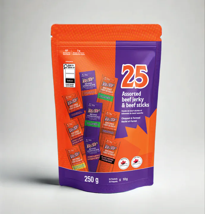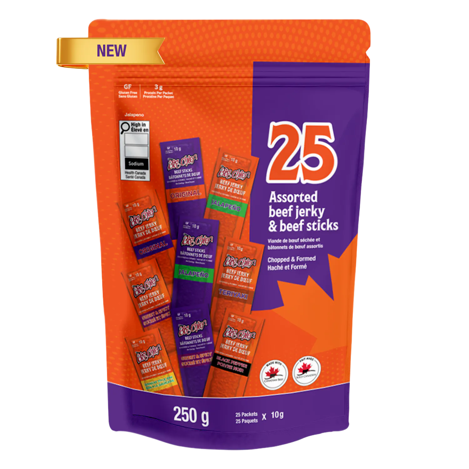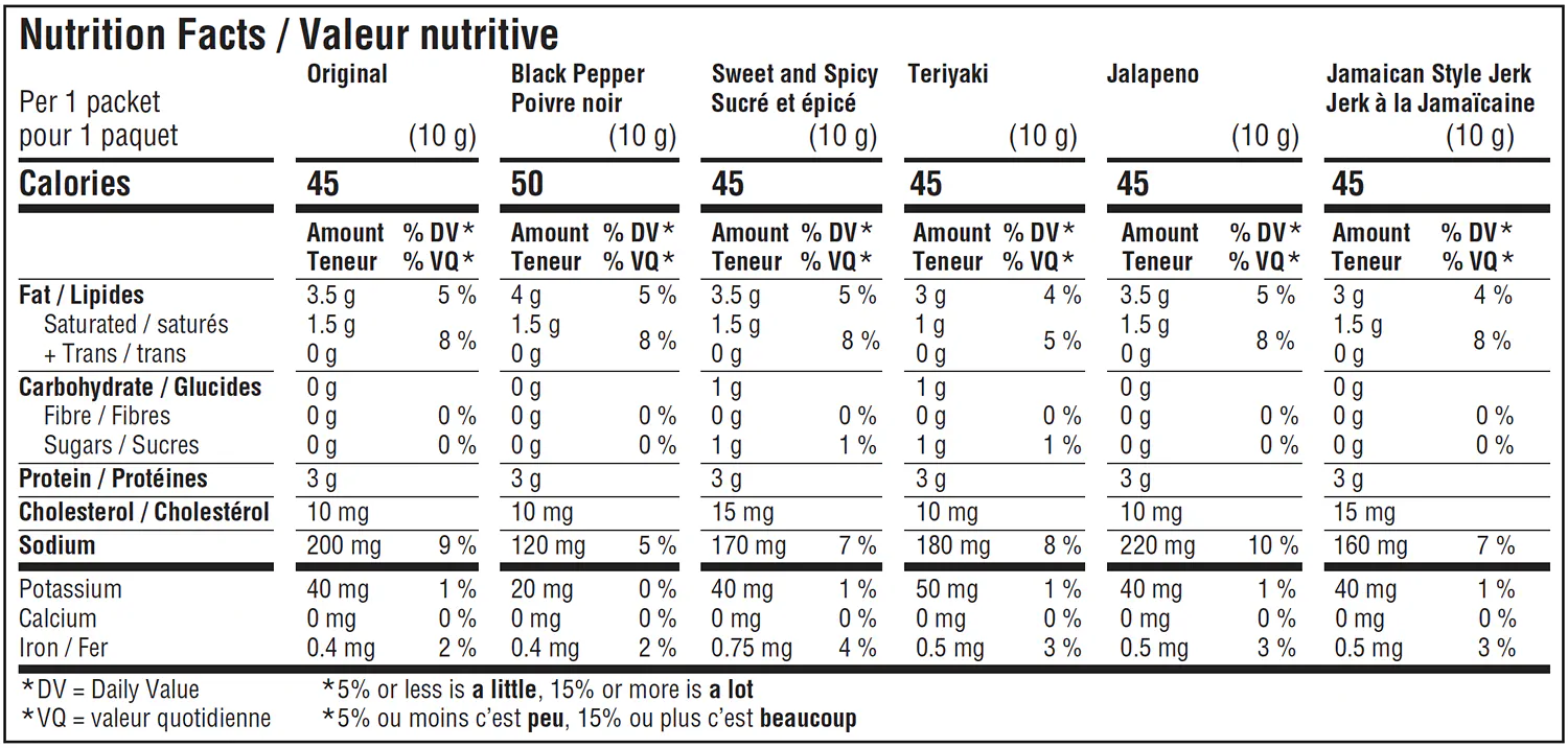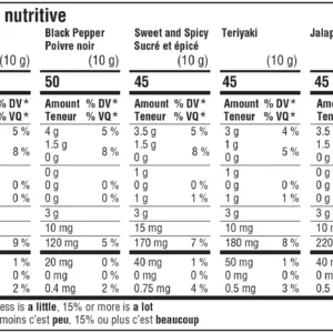 Jalapeno: Ingredients: Beef, Salt, Sugars (sugar, dextrose, maltodextrin), Monosodium glutamate, Dehydrated jalapeno, Spices, Hydrolyzed soy protein, Jalapeno extract, Sodium erythorbate, Yeast extract, Sodium nitrite, Natural smoke flavour. Contains: Soy Ingrédients : Bœuf, Sel, Sucres (sucre, dextrose, maltodextrine), Glutamate monosodique, Jalapeno déshydraté, Épices, Protéine de soja hydrolysée, Extrait de jalapeno, Erythorbate de sodium, Extrait de levure, Nitrite de sodium, Arôme de fumée naturelle. Contient : Soja