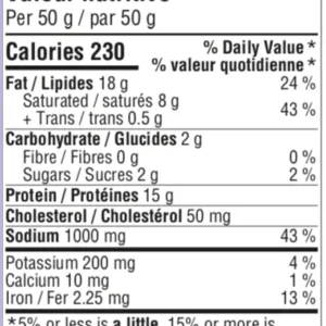 Ingrédients : Bœuf, Sel, Sucres (sucre, dextrose, maltodextrine), Glutamate monosodique, Épices, Protéine de soja hydrolysée, Erythorbate de sodium, Extrait de levure, Nitrite de sodium, Arôme de fumée naturelle.